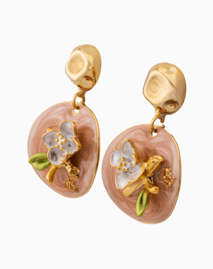 طراوت شکوفههای بهاری در گوش شما. این گوشواره آویز شوکا با طراحی ظریف شکوفه میناکاری شده بر روی پلاک صورتی درخشان، انتخابی رمانتیک و هنرمندانه برای افزودن لطافت به استایل شماست.