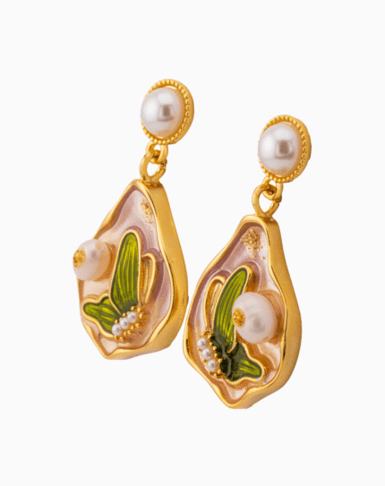 تلفیقی از شکوه سبک باروک و ظرافت طبیعت. گوشواره میخی دست ساز شوکا با مروارید باروک طبیعی و گل میناکاری شده بر زمینهای از مینای سبز تیره، یک اکسسوری هنری و لوکس برای استایلی فراموشنشدنی.