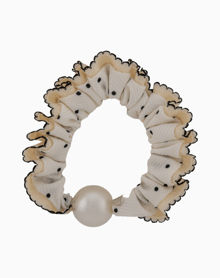 اسکرانچی شیک شوکا با طرح کلاسیک خالخالی سفید و کرم. این مدل با حاشیه چیندار کرم و یک مروارید درشت، انتخابی بینظیر برای افزودن یک المان وینتیج و جذاب به استایل شماست.