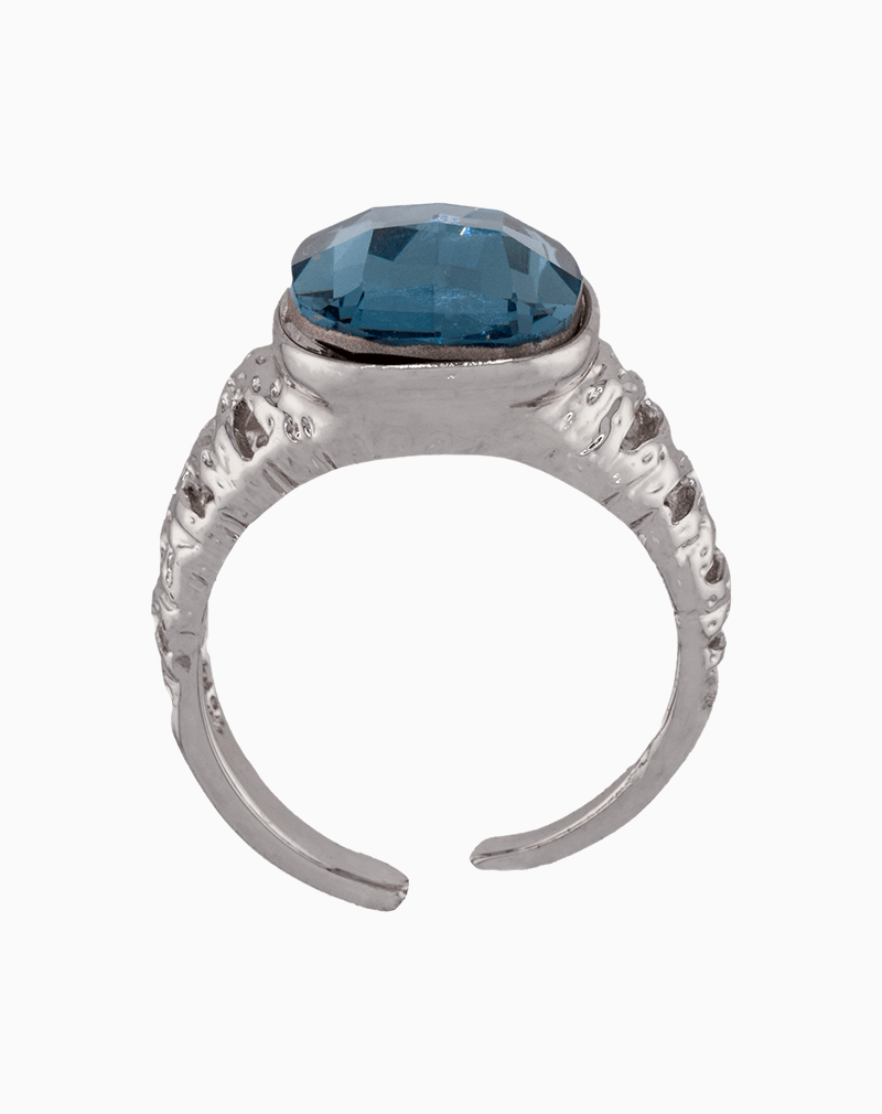 انگشتر باز زنانه شوکا با آبکاری نقره و نگین بیضی آبی کریستالی، مناسب استایل خاص و هدیه مدرن.