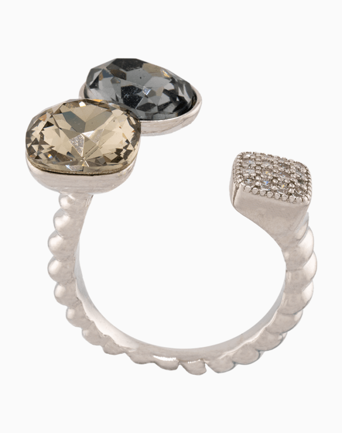 انگشتر باز زنانه شوکا ، دو نگین کریستال قرمز و شامپاینی و نگین مکعبی شفاف، ویژه استایل خاص.