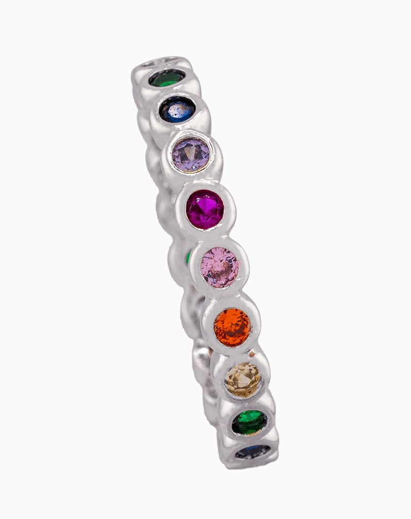 در سرتاسر این حلقه، نگینهای گرد و رنگارنگ با الهام از پالت رنگینکمان، در یک چیدمان مدرن بِزِل (Bezel) قرار گرفتهاند. این سبک چیدمان نه تنها به خوبی از نگینها محافظت میکند، بلکه ظاهری یکپارچه و جذاب به انگشتر میبخشد. این قطعه ظریف و چشمنواز، انتخابی ایدهآل برای افزودن یک پاپ رنگی به استایل روزمره شماست و میتواند به تنهایی یا در کنار سایر انگشترها برای خلق یک استایل لایهای (Stacking) استفاده شود.