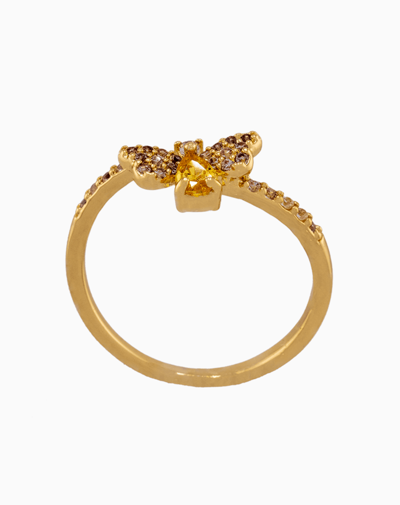 رکاب انگشتر با آبکاری طلایی گرم و درخشان پوشیده شده و نیمی از آن نیز با کریستالهای سفید به دقت نگینکاری شده است که این درخشش تا بالهای زنبور ادامه مییابد. طراحی فریسایز (یله) و باز این انگشتر، استفاده از آن را برای سایزهای مختلف انگشت ممکن میسازد. این انگشتر یک قطعه اکسسوری عالی برای افزودن حسی از شادابی و ظرافت به استایل روزمره و همچنین یک هدیه بینظیر و پرمعناست.
