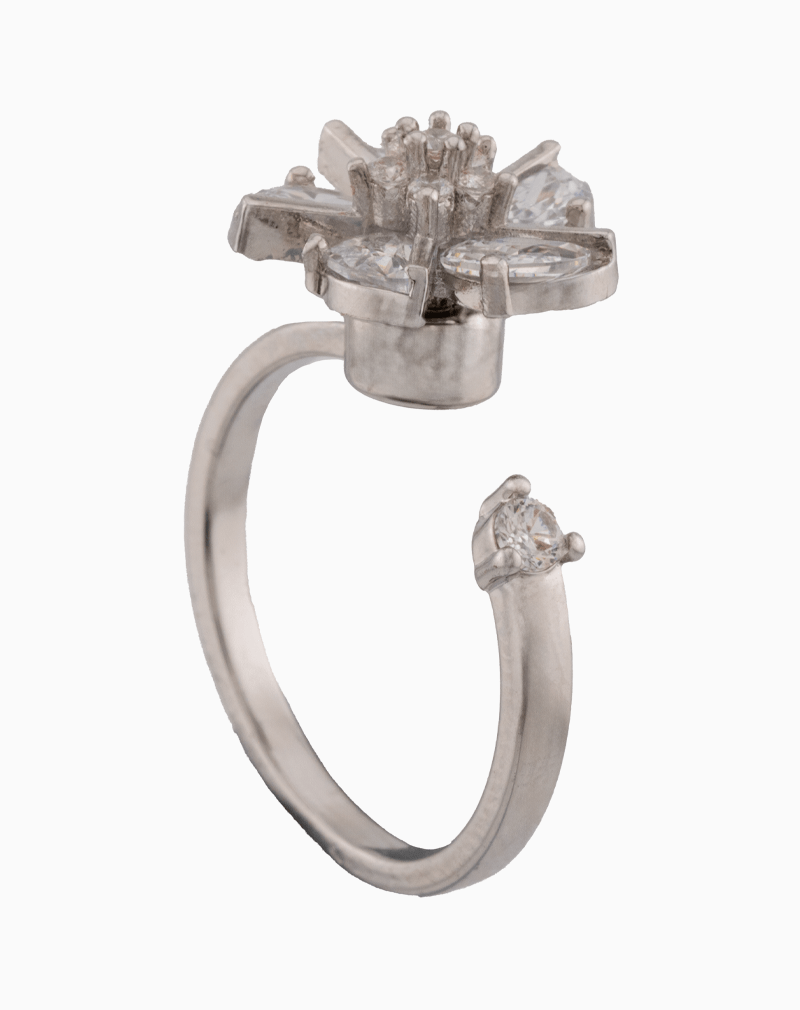 این انگشتر زنانه از برند شوکا، یک شاهکار طراحی است که با الهام از زیبایی طبیعی گل، جلوهای بینظیر خلق کرده است. بدنه انگشتر با آبکاری رادیوم، درخششی نقرهای و ماندگار دارد. نقطه کانونی این اثر، گلی با پنج گلبرگ است که هر گلبرگ از یک نگین درشت با تراش گلابی یا اشکی (Pear Cut) ساخته شده است. این تراش خاص، نور را به شکلی فوقالعاده بازتاب داده و درخششی خیرهکننده ایجاد میکند.