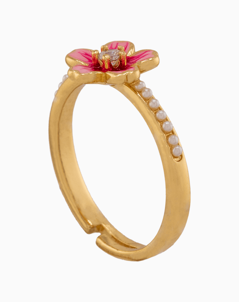 ظرافت یک باغچه روی انگشتان شما! انگشتر فریسایز شوکا با آبکاری طلا، تزئین شده با گل میناکاری صورتی، نگین درخشان و مرواریدهای ظریف. انتخابی عالی برای استایلی لطیف و زنانه.