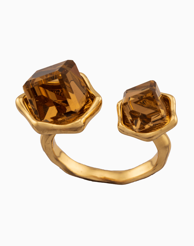 انگشتر زنانه باز با آبکاری طلا و نگینهای کریستال مکعبی قهوهای، مدرن و خاص، برند شوکا.