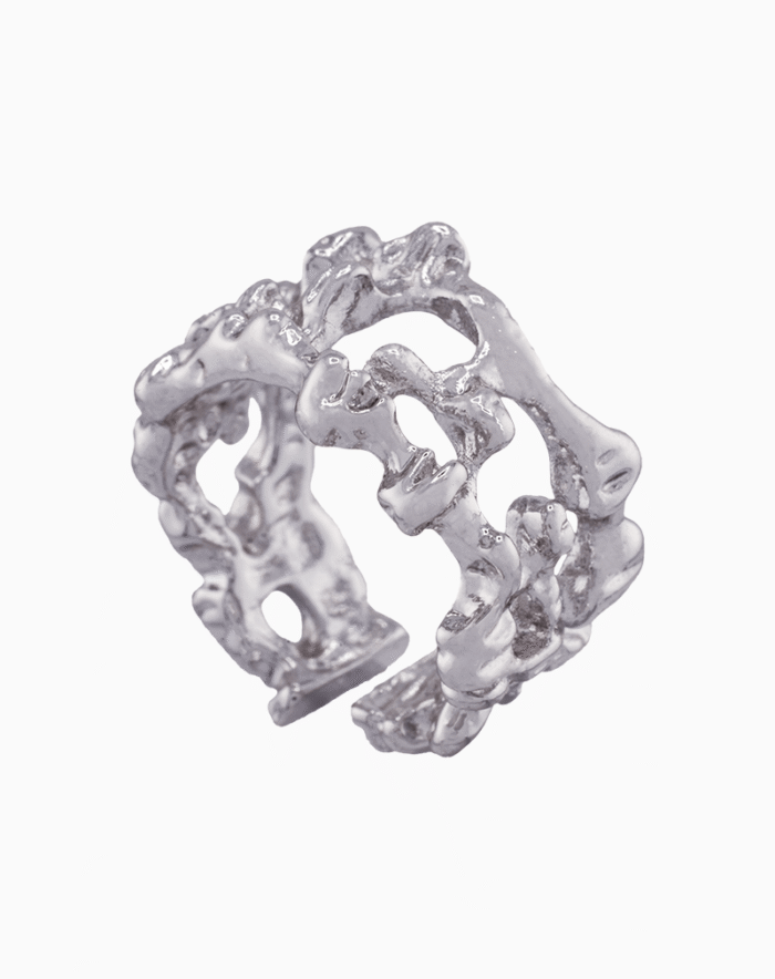 این انگشتر زنانه از برند شوکا، یک اثر هنری پوشیدنی است که با فرم ارگانیک و بافت خاص خود، شما را متمایز میکند. طراحی این انگشتر پهن و فریسایز، تداعیگر فلز مذاب، صخرههای آتشفشانی یا ساختار پیچیده مرجانهای دریایی است. این نسخه با آبکاری نقرهای، جلوهای سرد، مدرن و شیک به طرح بخشیده است.