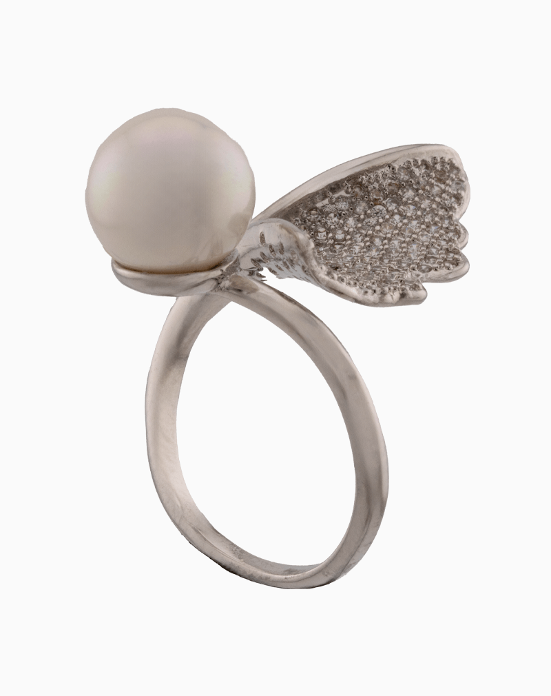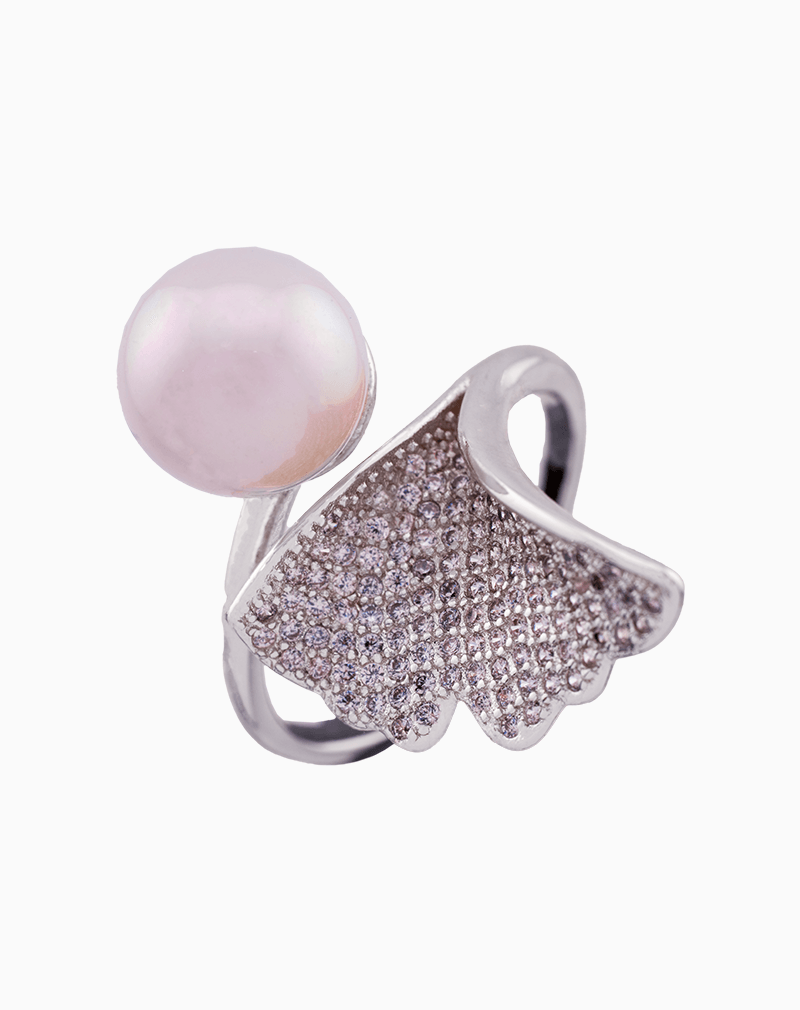 انگشتری هنری با طراحی برگ جینکگو و مروارید درخشان. با آبکاری نقره و نگینهای زیرکونیا، جلوهای مدرن و شیک به دستان شما میبخشد.