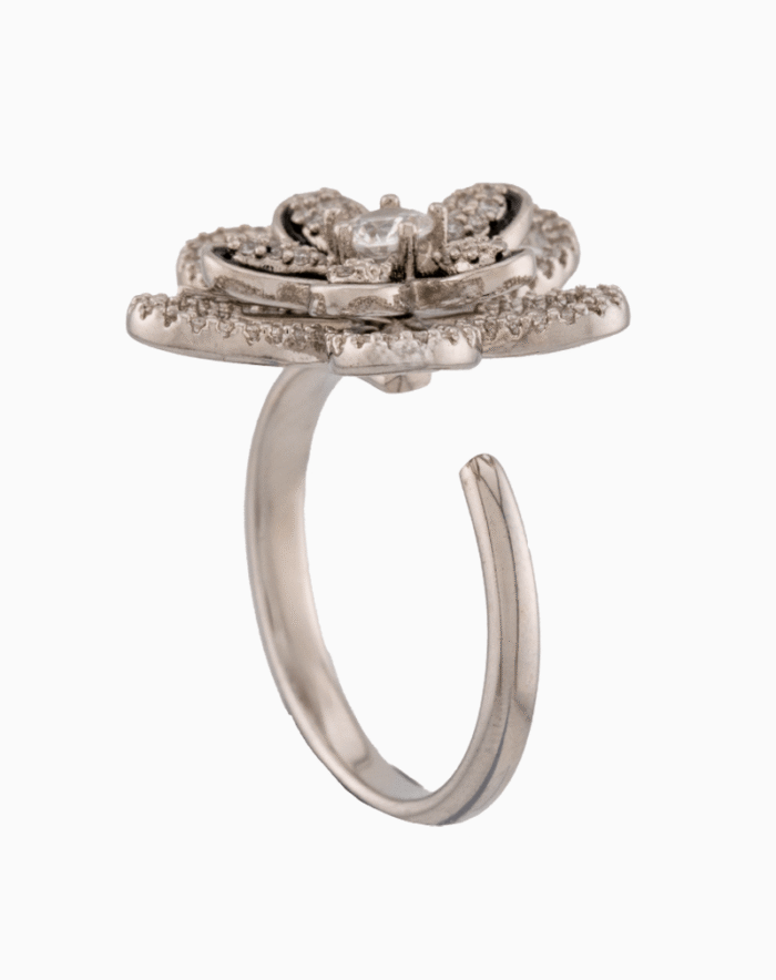 هنر و ظرافت در قالب یک گل کاملیا. این انگشتر فری سایز باشکوه از برند شوکا، با طراحی سهبعدی، نگینکاری میکرو-پیو و جزئیات میناکاری مشکی، تعریف جدیدی از یک اکسسوری لوکس ارائه میدهد.