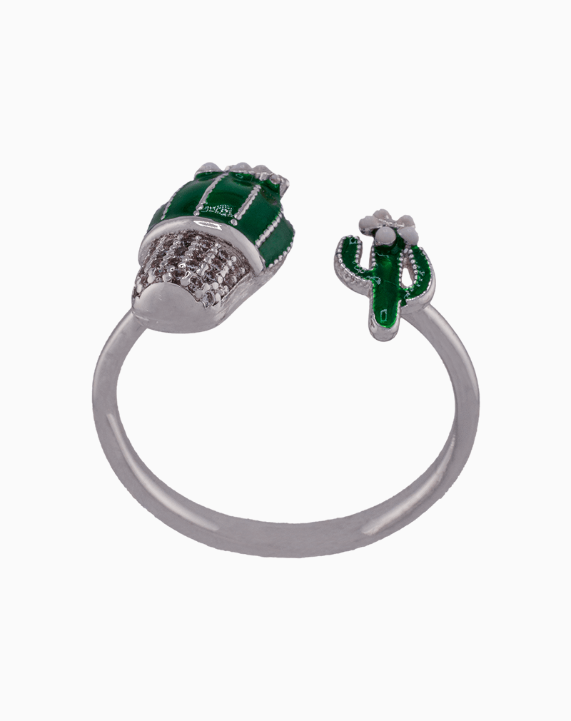 نسخه نقرهای انگشتر فانتزی کاکتوس! این انگشتر خاص با آبکاری رودیوم، میناکاری سبز و نگینهای درخشان، یک انتخاب مدرن و جسورانه برای استایلهای منحصربهفرد است. طراحی فریسایز آن راحتی شما را تضمین میکند.