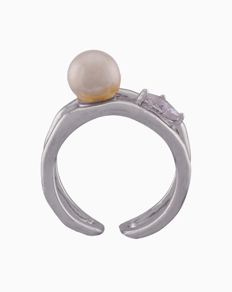 انگشتر زنانه مدرن و هنری با آبکاری نقرهای، طراحی باز، تزیین شده با مروارید مصنوعی سفید و نگین کریستال قلبی. سایز قابل تنظیم، ایدهآل برای هدیه و استفاده روزمره.
