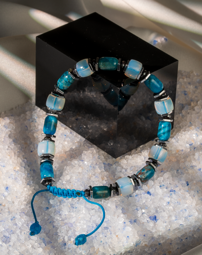 دستبندی مدرن و زنانه اسپرت با ترکیبی هنرمندانه از سنگ طبیعی آپاتیت آبی، مهرههای سنتتیک سفید یخی و حدید دودی. پالت رنگی اقیانوسی و طراحی مدرن این دستبند، آن را به انتخابی عالی برای استایل کژوال شما تبدیل کرده است.