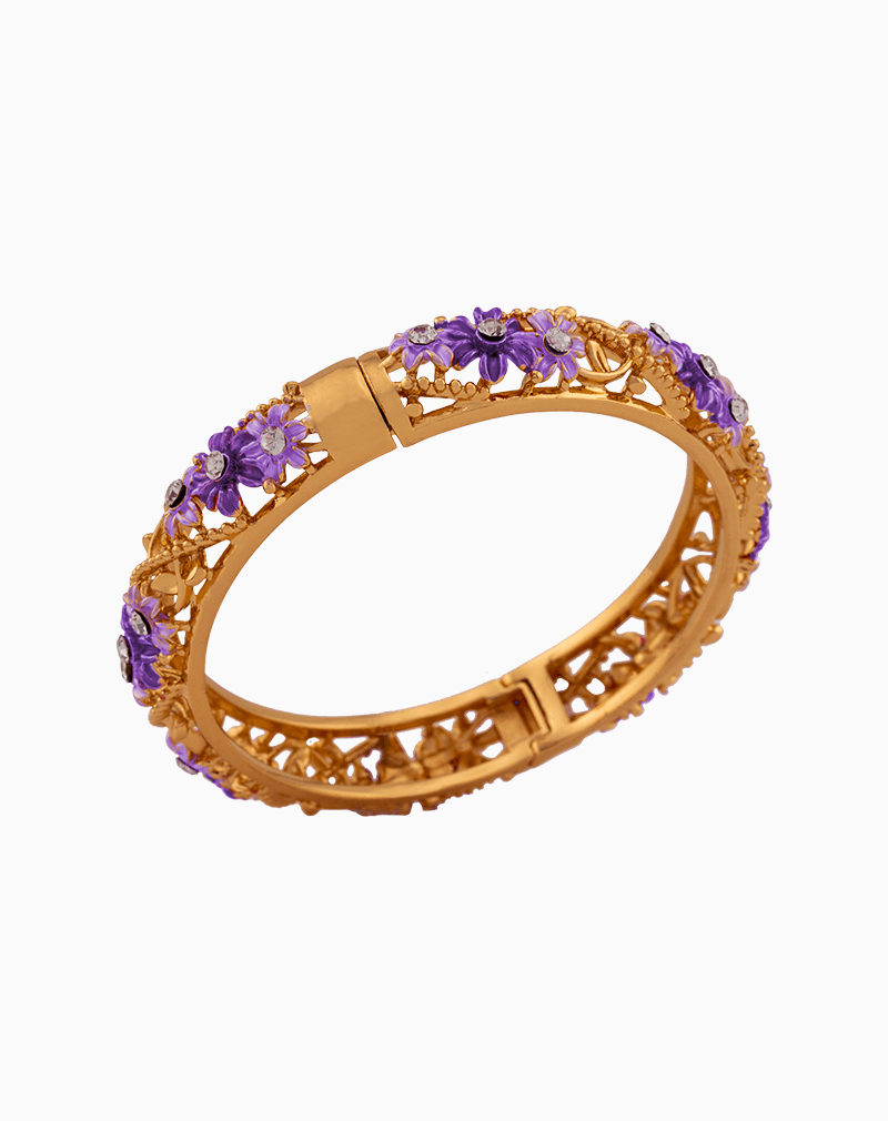 تجلی شکوه و زیبایی رنگ بنفش بر دستان شما. دستبند النگویی طلایی شوکا با گل‌های میناکاری شده در دو طیف رنگ بنفش و نگین‌های کریستالی درخشان. انتخابی لوکس و خاص برای استایلی به‌یادماندنی.