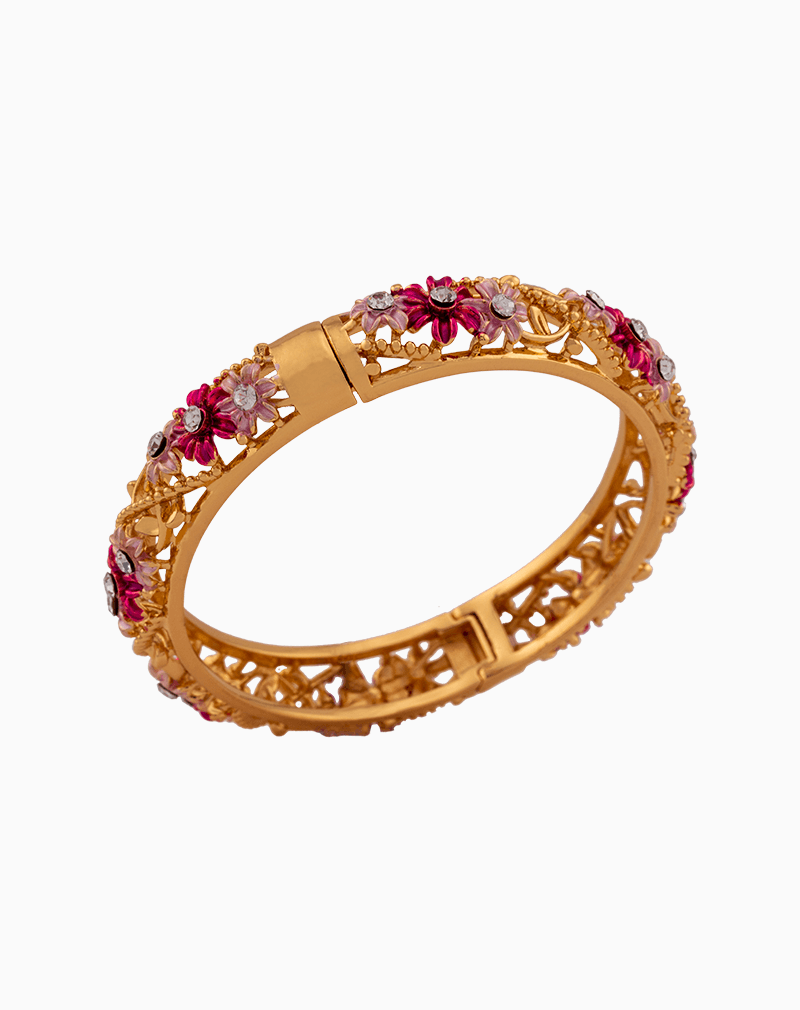 ظرافت شکوفهها بر دستان شما. دستبند النگویی شوکا با طراحی بینظیر گلهای میناکاری شده به رنگهای صورتی و سرخابی که هر یک با نگینی درخشان در مرکز تزئین شدهاند. با بدنه طلایی، انتخابی رمانتیک و مجلسی.