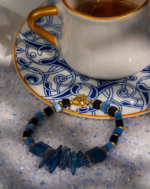 دستبندی خاص از برند شوکا با سنگهای طبیعی آبی و مهرههای هندسی، مزین به ستاره طلایی؛ مناسب برای استایلهای خاص و امروزی.
