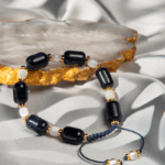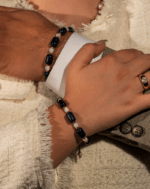 دستبند زنانه شیک و مدرن از برند شوکا، با ترکیبی خیرهکننده از سنگ دلربای سرمهای درخشان و مهرههای صدف سفید. جزئیات طلایی این دستبند، آن را به انتخابی عالی برای درخشش در هر موقعیتی تبدیل کرده است.