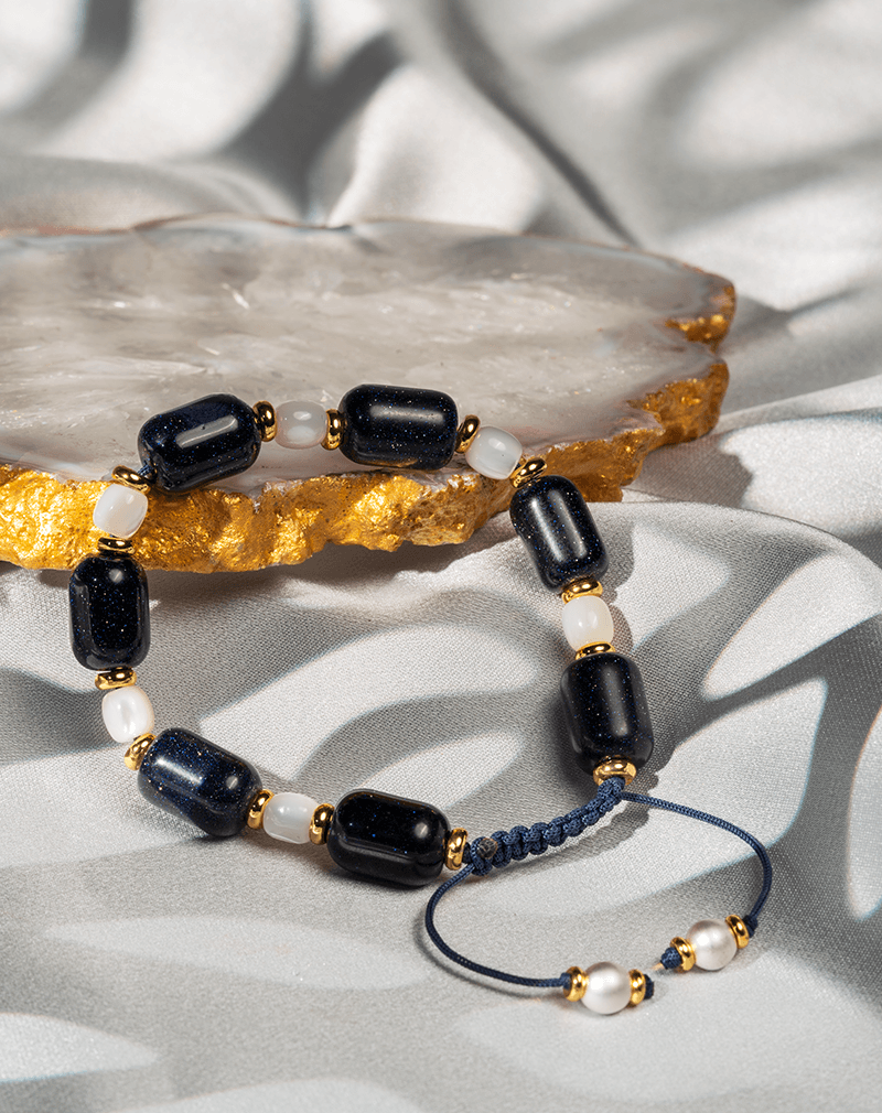 در کنار این درخشش سحرانگیز، مهرههای سفید و مات از جنس صدف طبیعی قرار گرفتهاند که تضادی زیبا و آرامشبخش ایجاد میکنند. خرجکارهای ظریف طلاییرنگ و قفل بافت سرمهای، این طراحی هنرمندانه را تکمیل کرده و به آن جلوهای شیک و امروزی بخشیدهاند. این دستبند با وزن سبک و طراحی قابل تنظیم، راحتی بینظیری را برای استفاده روزمره فراهم میکند و به سادگی با انواع استایلها، از کژوال تا رسمی، هماهنگ میشود.