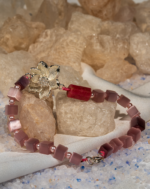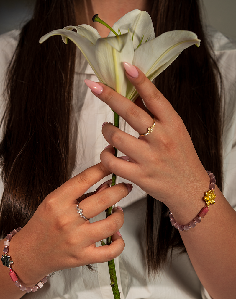دستبندی سرشار از لطافت و عشق، با آویز گل لوتوس نقرهای و سنگ زیبای رودونیت. ترکیب رنگهای یاسی و صورتی در کنار جزئیات نقرهای، این دستبند را به نمادی از آرامش و بهبود روابط عاطفی تبدیل کرده است.