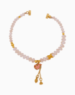 یک قطعه هنری پوشیدنی با مهرههای درخشان صدف، آویز قلب میناکاری شده صورتی و قفل مگنتی طلایی. این دستبند نمادی از لطافت، عشق و زیبایی زنانه است.