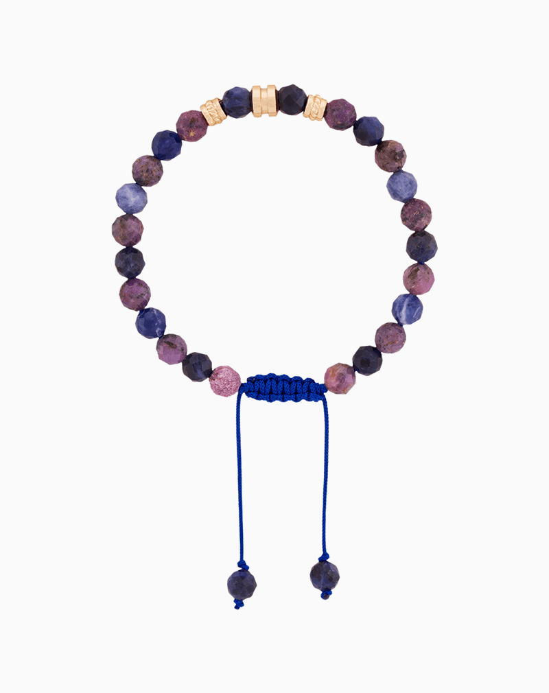 دستبندی با ترکیب رنگی جسورانه و هنرمندانه از سنگ آیولایت آبی و مهرههای صورتی. جزئیات طلایی در کنار نخ آبی درخشان، این اکسسوری دستساز را به قطعهای خاص و چشمنواز برای استایل شما تبدیل میکند.