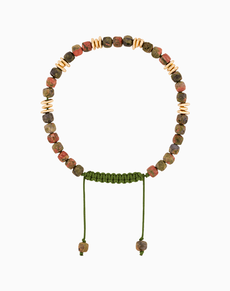 دستبندی مردانه با الهام از قدرت و زیبایی طبیعت، ساخته شده از سنگ اوناکیت. ترکیب رنگهای خاکی سبز و صورتی که با مهرههای استیل دودی، استایلی مدرن، طبیعی و مردانه خلق میکند.
