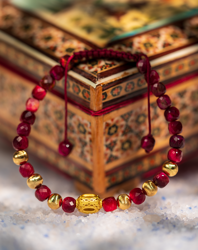 این دستبند زنانه از برند شوکا، تلفیقی از قدرت طبیعت و ظرافت هنر است. مهرههای تراشخورده و مکعبی سنگ جاسپر صورتی، با رنگ غنی و عمیق زرشکی، در مرکز توجه قرار دارند. جاسپر به عنوان “سنگ پرورشدهنده” شناخته میشود و انرژی آرامبخش و حمایتی آن به کاهش استرس و ایجاد حس ثبات و تعادل شهرت دارد.<br><br>در طراحی این دستبند، مهرههای کروی و یک مهره مرکزی بیضیشکل با آبکاری طلایی مات و طرحدار، درخششی لوکس و گرم به آن بخشیدهاند. قفل کشویی بافته شده با نخ زرشکی همرنگ، علاوه بر تنظیم آسان برای هر سایز مچی، هماهنگی بینظیری با رنگ سنگها ایجاد کرده است. این دستبند انتخابی فوقالعاده برای بانوانی است که به دنبال اکسسوریهای پرانرژی، معنادار و با رنگهای گرم و جذاب هستند.