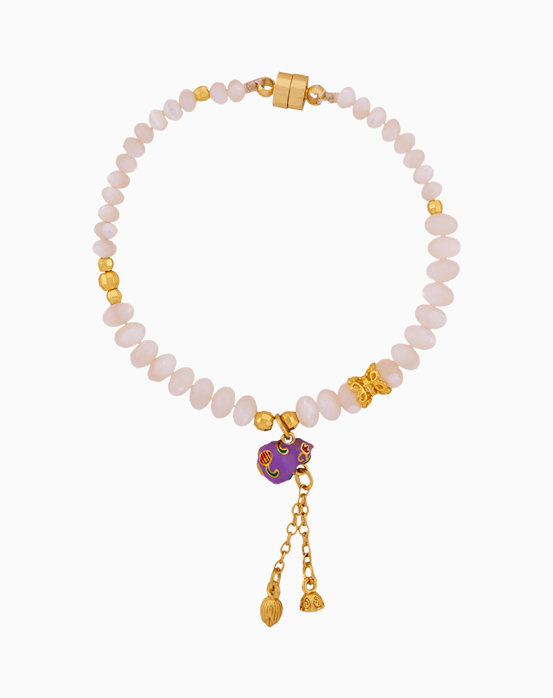 دستبند زنانه زیبا با مهرههای کرمی صدفی و تزئینات طلایی، مزین به آویز قلب بنفش لعابی که جلوهای خاص و هنری به استایل شما میدهد.