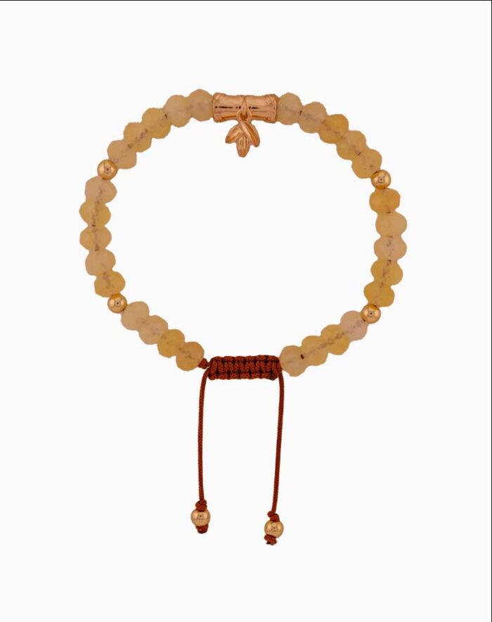 در بخش بالایی دستبند، مهره و آویز فلزی طلاییرنگ با طراحی ظریف قرار گرفته که حس ظرافت و ارزش بصری محصول را افزایش میدهد. زیرکار دستبند از نخ قهوهای مقاوم ساخته شده و بهصورت گرهای قابل تنظیم طراحی شده است تا برای سایزهای مختلف مچ مناسب باشد.