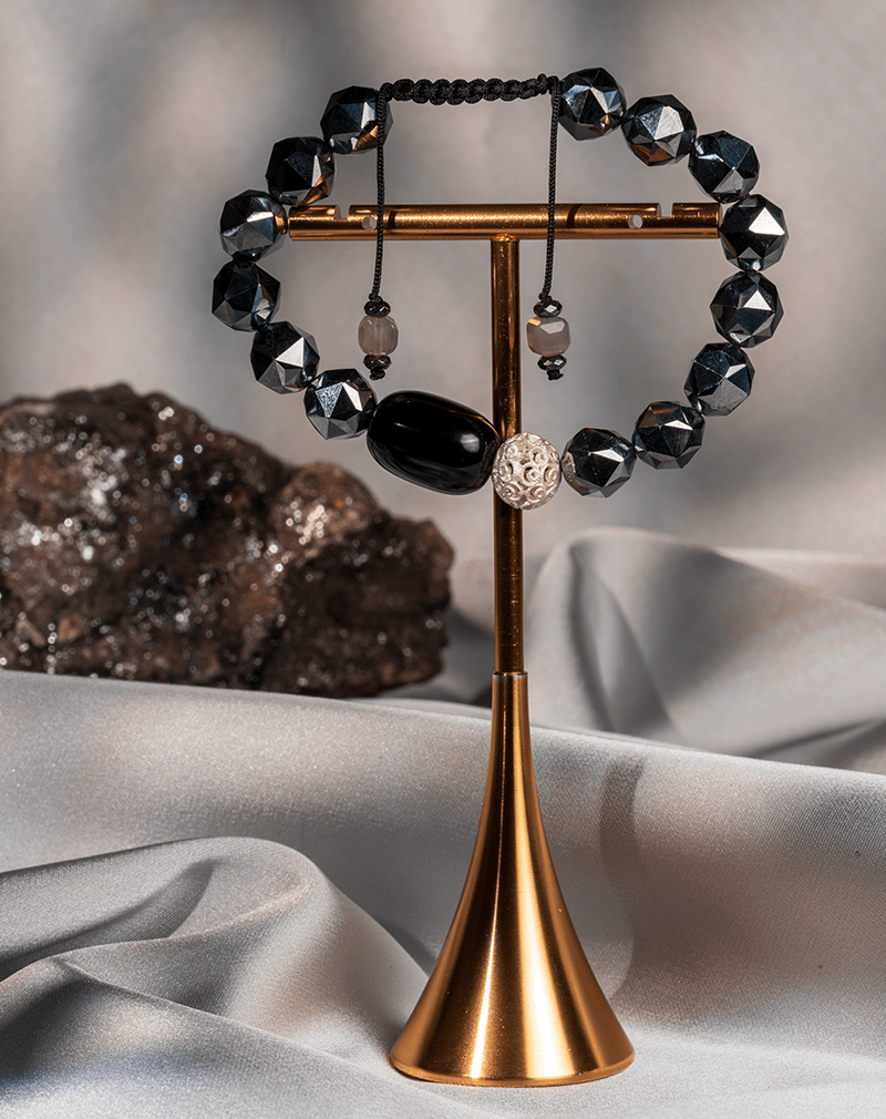 دستبند مردانه دستساز شوکا با ترکیبی مدرن از سنگ حدید تراش ستارهای، سنگ اونیکس مشکی و یک گوی مرکزی حکاکیشده. اکسسوریای شیک و قدرتمند با پالت رنگی خنثی که با هر استایلی به زیبایی ست میشود.
