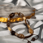 در کنار این سنگ منحصربهفرد، مهرههای سفید صدفی قرار گرفتهاند که تضادی چشمنواز و متعادل ایجاد میکنند. خرجکارهای طلایی و قفل بافت سرمهای، طراحی این قطعه را به اوج میرسانند و آن را به یک اکسسوری ایدهآل برای استایلهای روزمره و شهری بدل میکنند. این دستبند نه تنها به تنهایی زیباست، بلکه گزینهای فوقالعاده برای ست کردن با واریانت زنانه و خلق یک نماد مشترک از زیبایی و علاقه است.