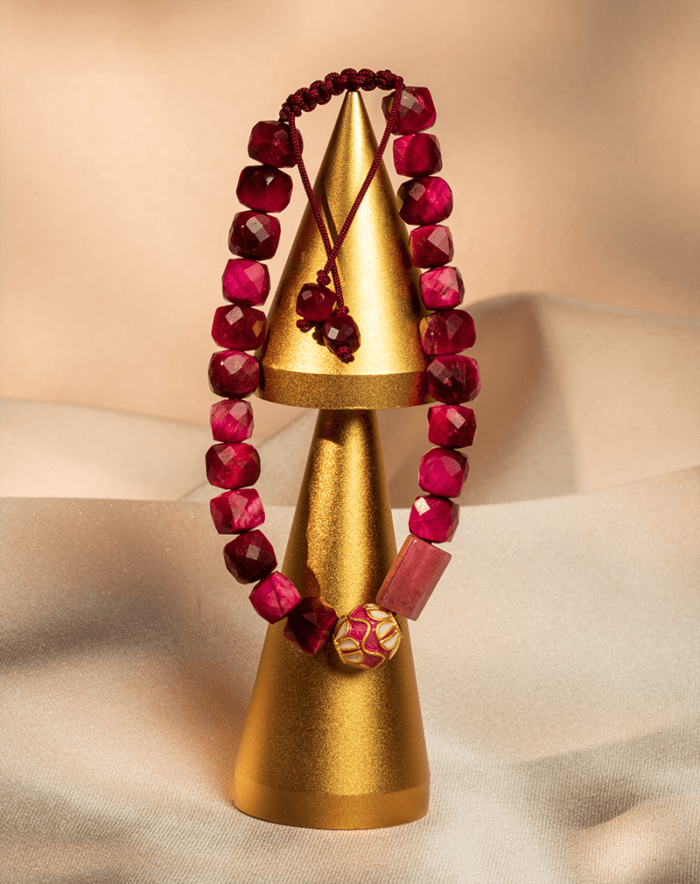 شهامت در رنگ، قدرت در سنگ. دستبند مردانه شوکا با ترکیب جسورانه سنگ چشم ببر سرخابی و رودونیت، انتخابی خاص برای مردانی است که رهبر سبک خود هستند.