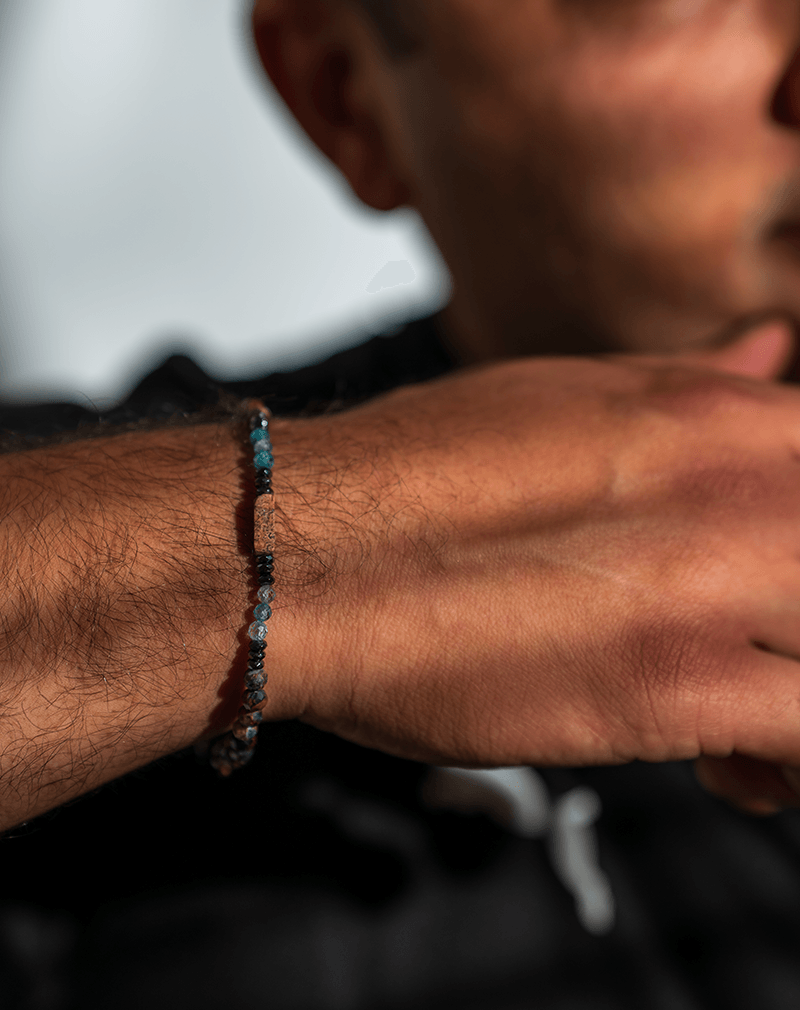 دستبند مردانه شوکا با سنگهای پیترسایت، جاسپر تصویری و کریستال آبی
