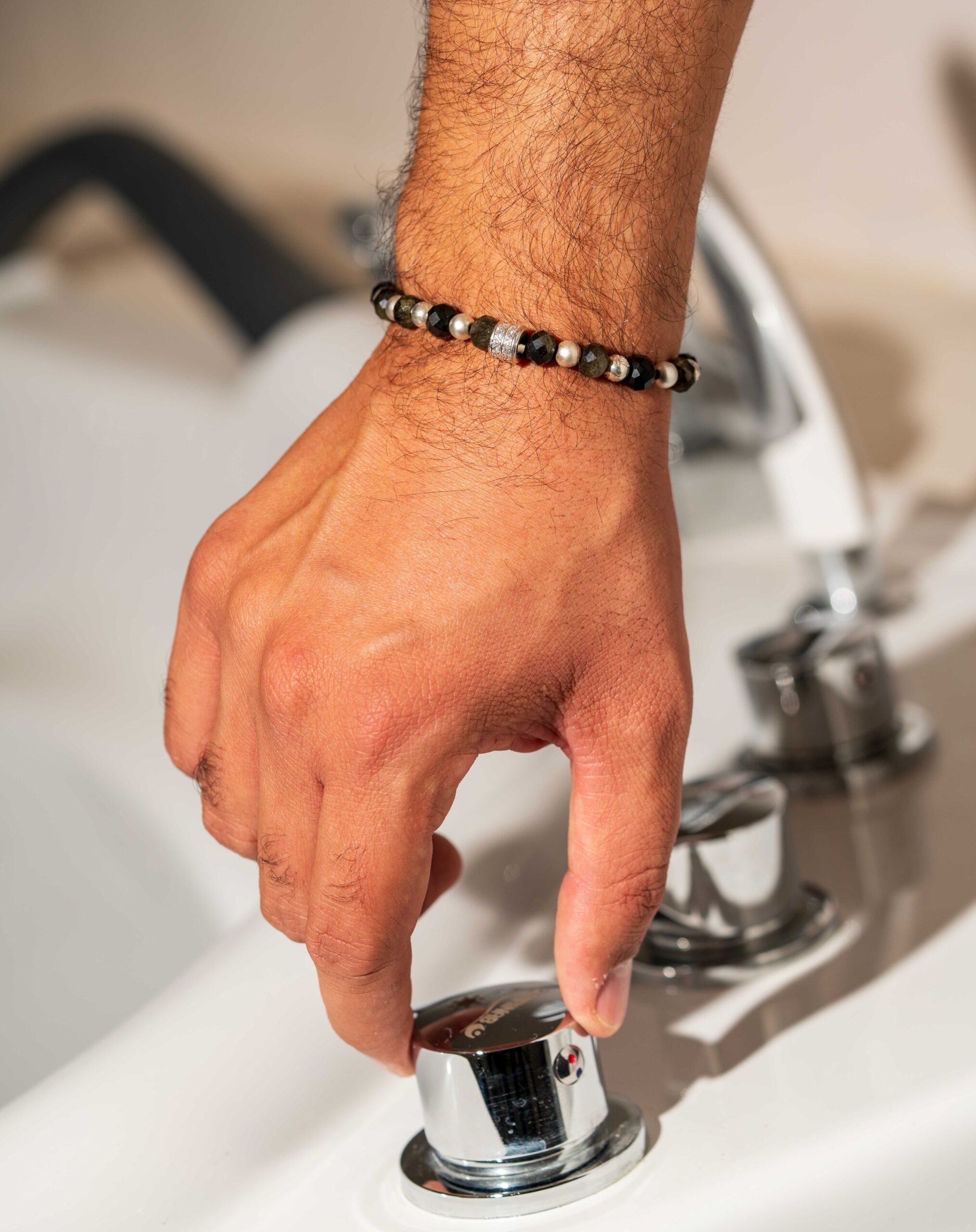 دستبند مردانه کلاسیک و باوقار، ترکیبی از مهرههای تراشخورده سنگ ابسیدین طلایی و اونیکس مشکی. تضاد درخشش طلایی و عمق رنگ مشکی در کنار گویهای نقرهای، استایلی لوکس و قدرتمند میآفریند.