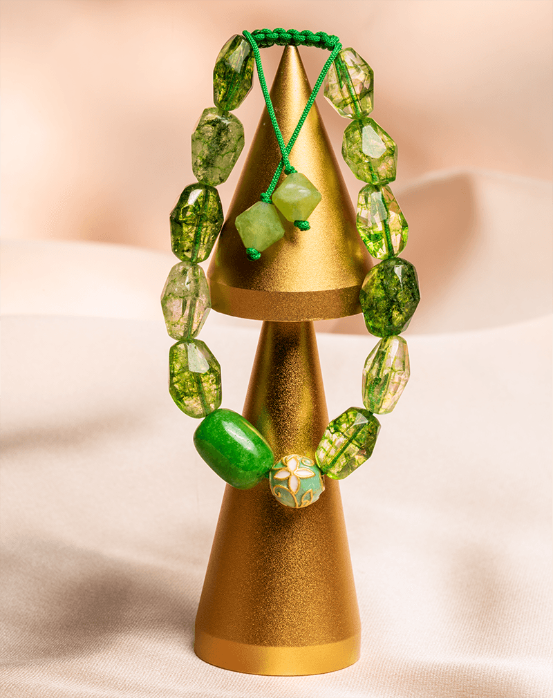 طراوت بهار و آرامش طبیعت بر دستان شما. دستبند شوکا با سنگهای پرهنیت و یشم سبز، مزین به مهره میناکاری با طرح شکوفه، نمادی از رشد و زیبایی برای استایل مردانه.