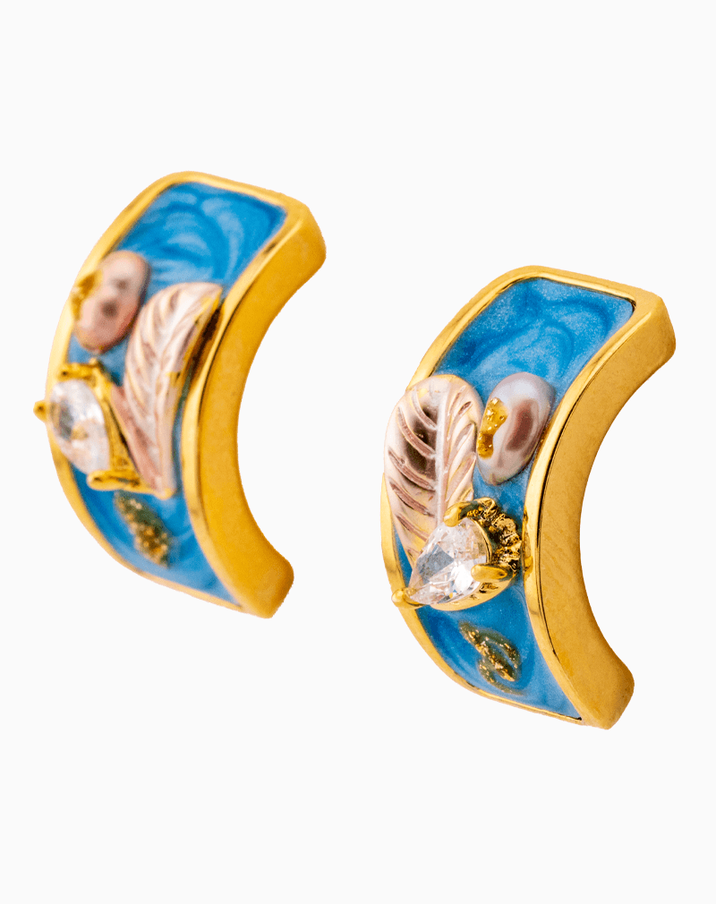 این گوشوارههای میخی مستطیلی شکل با طراحی خاص و رنگآمیزی منحصربهفرد، انتخابی عالی برای کسانی است که به دنبال استایلی شیک و متفاوت هستند. زمینه آبی صدفی با جلوهای موجدار، در ترکیب با قاب طلایی براق، حسی لوکس و هنری ایجاد میکند. مروارید صورتی کوچک و برگ فلزی رزگلد روی سطح گوشواره نشستهاند و در کنار نگین اشکی شفاف، جلوهای درخشان و چشمگیر به این زیورآلات میبخشند. این گوشوارهها مناسب استفاده در مهمانیها و مجالس رسمی است و میتواند استایل شما را خاص، پرزرقوبرق و خلاقانه جلوه دهد. طراحی سبک و راحت آن، استفاده روزمره را نیز امکانپذیر میسازد.