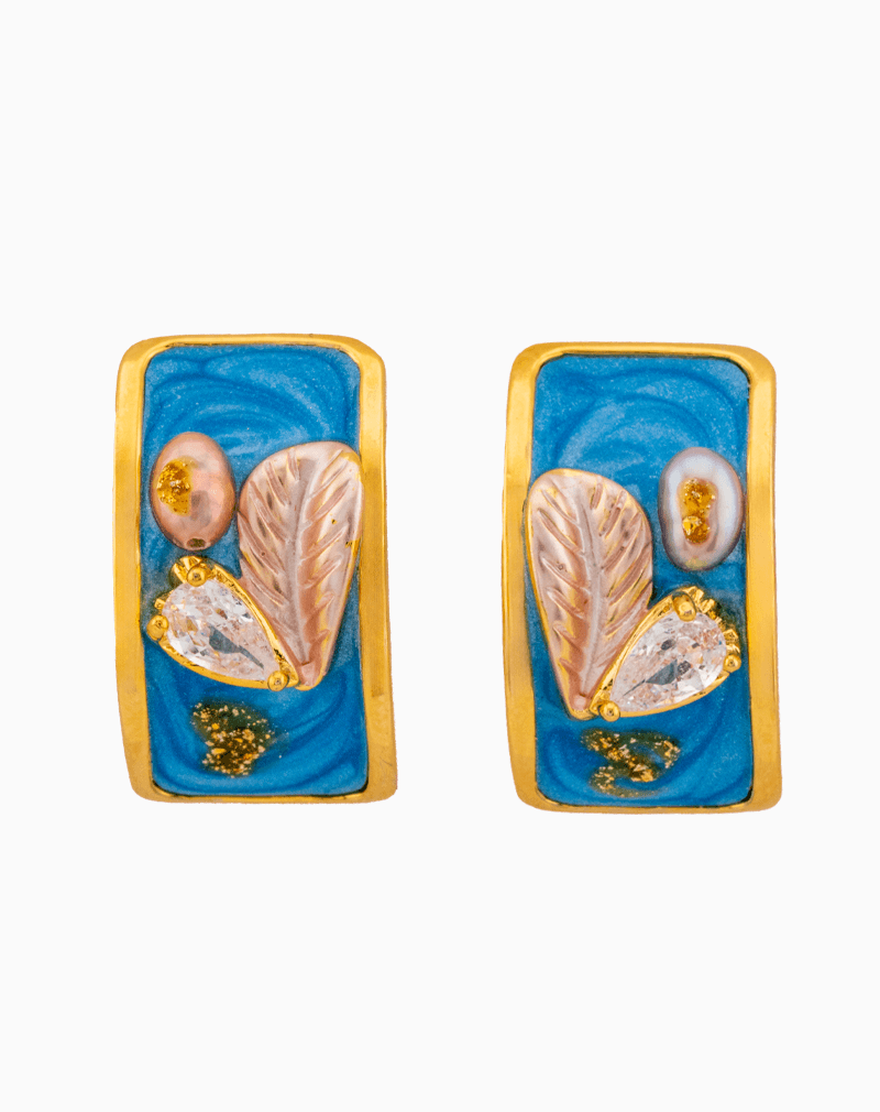 گوشواره میخی طلایی مستطیلی با زمینه آبی صدفی، مروارید صورتی و نگین اشکی درخشان؛ ترکیبی خاص و لوکس برای استایلهای رسمی و مجلسی.