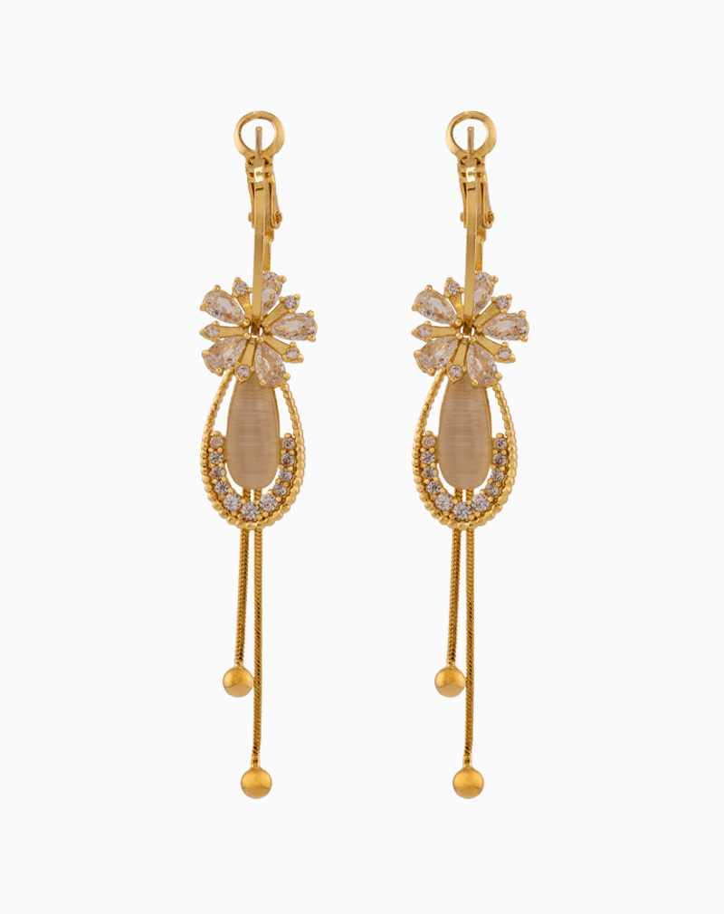 گوشواره زنانه ماژولار شوکا با قابلیت استفاده به ۴ روش متفاوت و ترکیبی گرم از رنگ طلایی و شامپاینی. این مدل با آبکاری طلا، گل درخشان کریستالی و آویز نگیندار، انتخابی ایدهآل برای شخصیسازی استایل شماست.