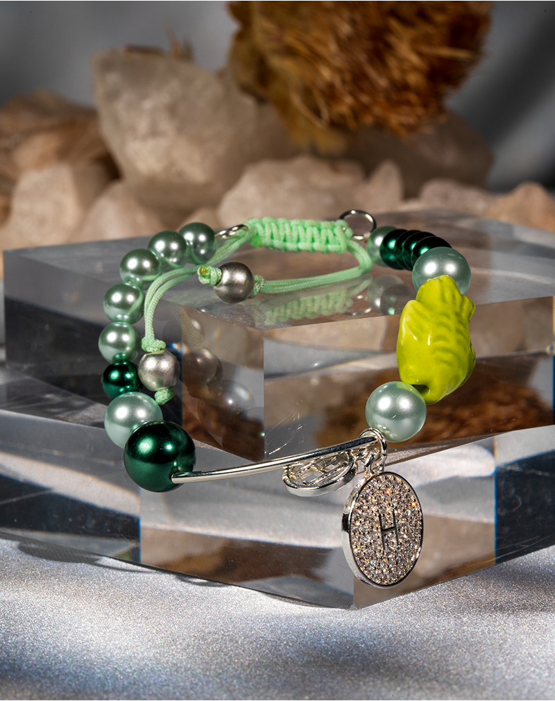 دستبند مهرهای نوجوان با ترکیب مروارید مصنوعی، مهرههای سبز و پلاک نگیندار نقرهایرنگ. طراحی سبک، بند قابل تنظیم و استایل شاد این دستبند، آن را به انتخابی عالی برای استفاده روزمره نوجوانان تبدیل کرده است.