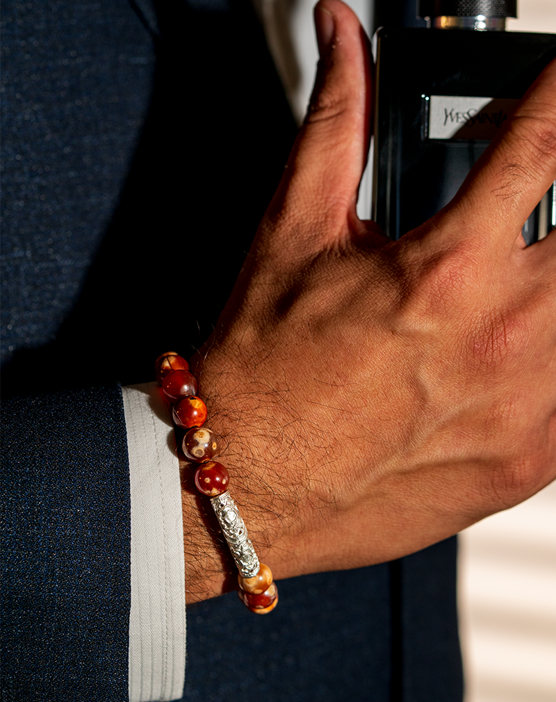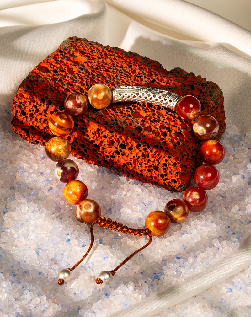 دستبند مردانه سنگ عقیق شوکا با ترکیب رنگهای گرم نارنجی و قهوهای، نمادی از قدرت، ثبات و تمرکز است. سنگ عقیق به افزایش اعتمادبهنفس، ایجاد تعادل ذهنی و دفع انرژیهای منفی شناخته میشود و انتخابی مناسب برای استفاده روزمره و آرامش درونی است.