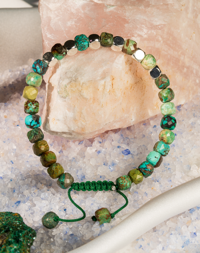 دستبند مردانه سنگ کریزوکولا شوکا با ترکیب رنگهای سبز و آبی فیروزهای، جلوهای طبیعی و آرامشبخش دارد. مهرههای چندوجهی این دستبند، در کنار بند نخی سبز قابل تنظیم، طراحی ساده اما چشمنوازی ایجاد کرده که بهراحتی با استایلهای روزمره و مینیمال مردانه هماهنگ میشود.