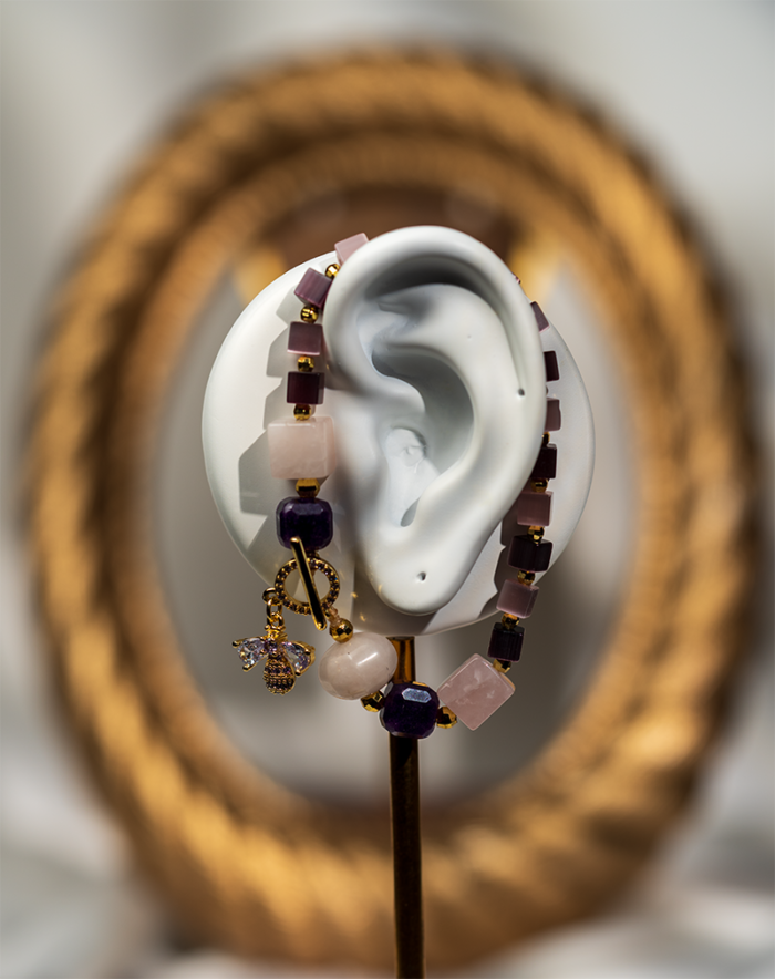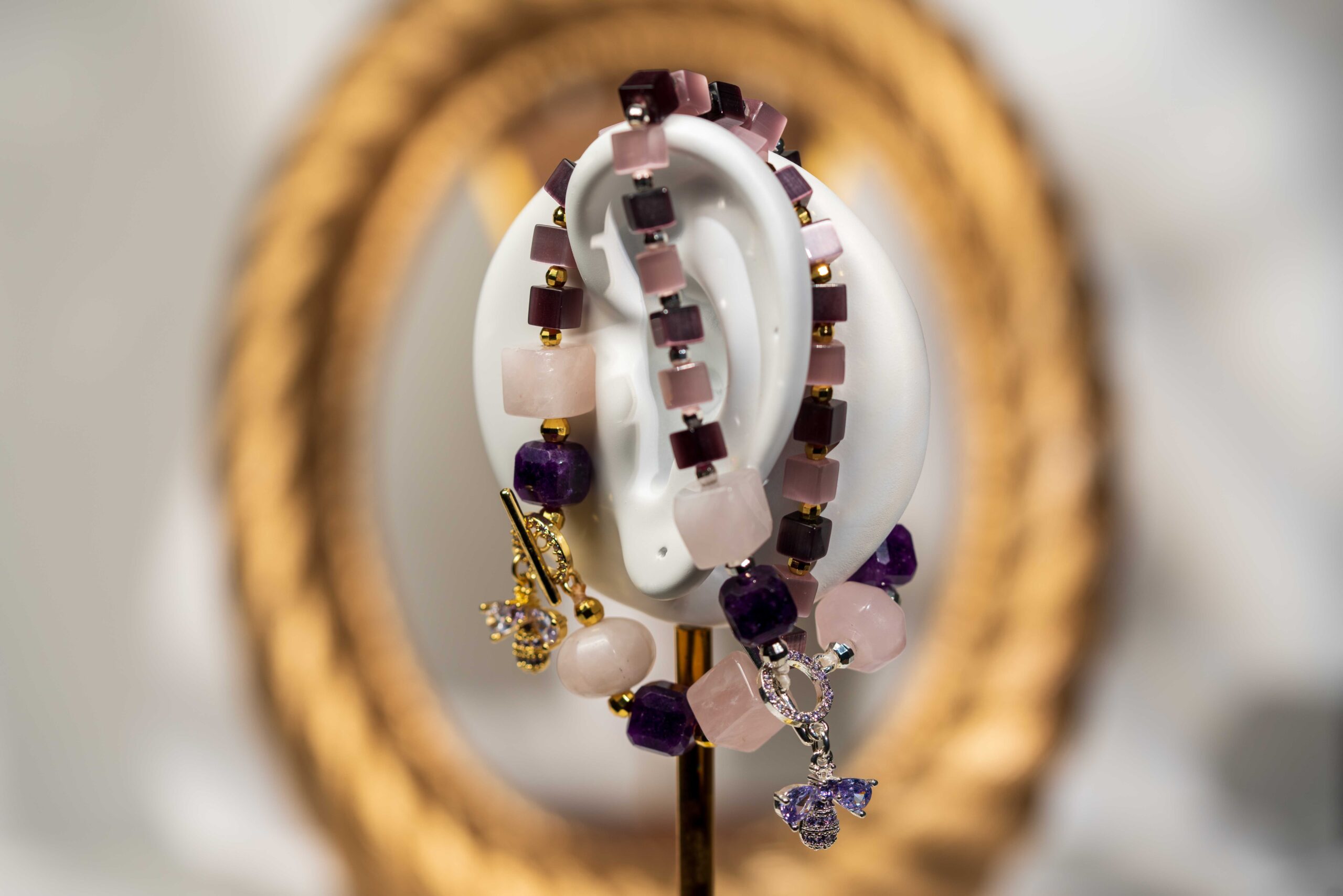 دستبند زنانه شوکا مدل کوارتز صورتی و آمتیست دستساز، با ترکیب سنگهای طبیعی صورتی و بنفش، مهرههای مکعبی کوارتز سنستیک و آویز زنبور نگینکاریشده طراحی شده است. این دستبند با قفل تاگل لاکچری (در نسخه طلایی یا نقرهای)، ظاهری پاستلی، لطیف و شیک ایجاد میکند و برای اسایلهای روزمره و هدیههای خاص ایدهآل است.