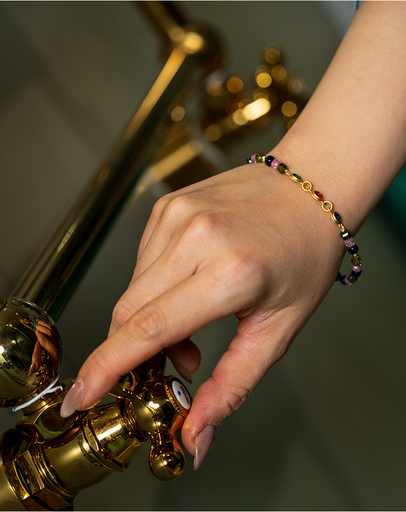 در بخش مرکزی دستبند، پلاکهای طلایی با نگینهای رنگی قرار گرفتهاند که جلوهای درخشان و متفاوت به این اکسسوری میبخشند. این طراحی باعث شده دستبند علاوه بر سادگی مهرهها، ظاهری خاص و چشمگیر داشته باشد.