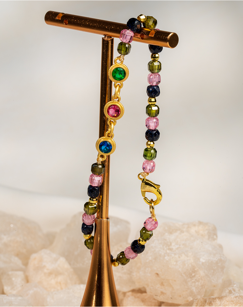 دستبند زنانه شوکا با ترکیب مهرههای گلدستون در رنگهای سرمهای، سبز و صورتی طراحی شده و با پلاکهای نگین رنگی طلایی جلوهای خاص و درخشان دارد. گلدستون به عنوان سنگی انرژیبخش شناخته میشود که به افزایش انگیزه، اعتماد به نفس و تقویت انرژی مثبت کمک میکند.
