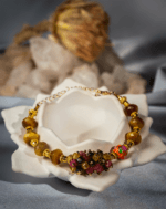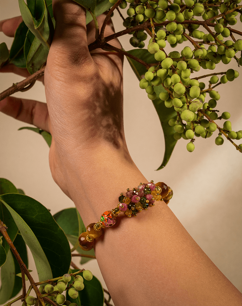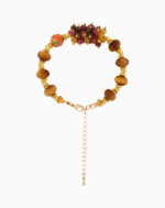 مهرههای سنگ چشمببر قهوهای در کنار سنگهای ریز گارنت صورتی تیره، در کنار مهره لعابی رنگارنگ مرجانی قرار گرفتهاند و هارمونی گرمی از رنگ و انرژی ایجاد کردهاند.