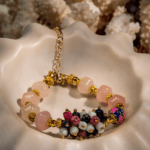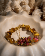 دستبند زنانه شوکا مدل چشمببر دستساز، با ترکیب سنگهای طبیعی در طیف قهوهای و صورتی، تزئینشده با مهرهی لعابی مرجانی و زنجیر طلایی قابل تنظیم. طراحی خاص و ظرافت طبیعی این دستبند، انتخابی منحصربهفرد برای استایل بوهمین و روزمره است.