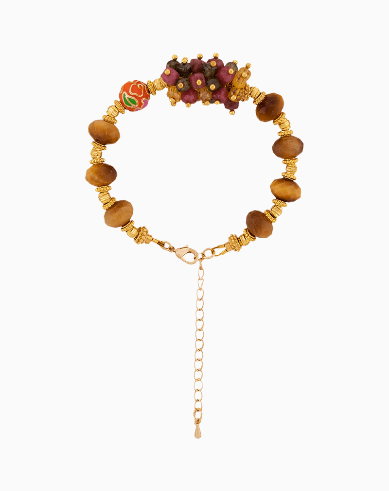 مهره‌های سنگ چشم‌ببر قهوه‌ای در کنار سنگ‌های ریز گارنت صورتی تیره، در کنار مهره لعابی رنگارنگ مرجانی قرار گرفته‌اند و هارمونی گرمی از رنگ و انرژی ایجاد کرده‌اند.