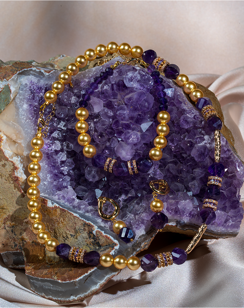آمتیست با درخشش بنفش خاص خود، حس آرامش، تمرکز و تعادل را در درون شما زنده میکند، در حالی که مرواریدهای کرمی و جزئیات طلایی درخشش و شکوهی سلطنتی به ظاهر شما میبخشند.
