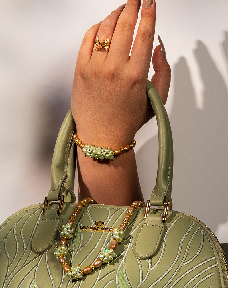 ست زنانه شوکا شامل گردنبند، دستبند و گوشواره با مروارید و خوشههای ظریف سبز در کنار مروارید قهوهای که جلوهای خاص، گرم و لوکس به استایل شما میبخشد.
