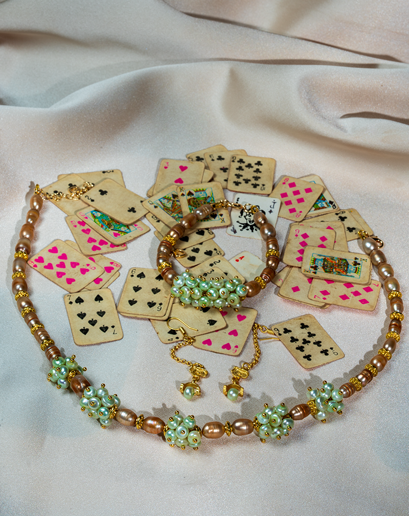 در طراحی گردنبند از مرواریدهای طلایی و مروارید قهوهای استفاده شده که به صورت متناوب در کنار یکدیگر قرار گرفتهاند. در بخشهایی از گردنبند خوشههای کوچک مهرههای سبز و مروارید قرار داده شده که جلوهای متفاوت و هنری به این زیورآلات میبخشند و باعث میشوند این ست از نظر بصری بسیار چشمگیر باشد.