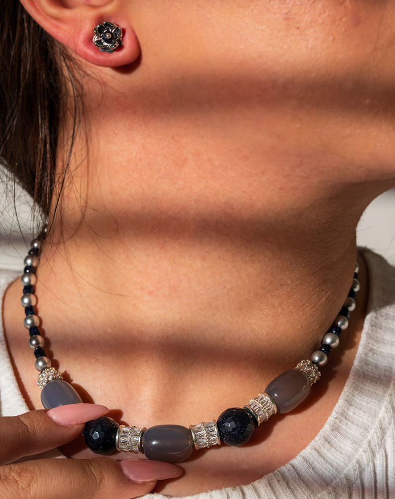 در مرکز گردنبند از مهرههای بزرگ عقیق طوسی در کنار گلدستونهای تیره استفاده شده که با جداکنندههای فلزی نقرهای تزئین شدهاند. این ترکیب باعث ایجاد تعادل بصری میان رنگهای سرد و درخشش فلز شده است.